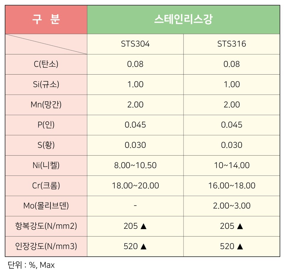 표로 304과 316을 비교하여 내식성 및 내열성 향상원소인 '몰리브덴'의 첨가하여