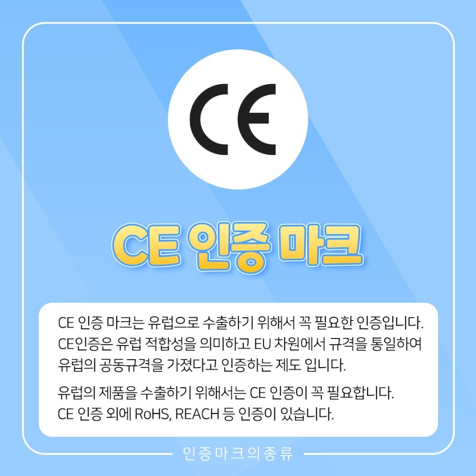 CE 인증 마크는 유럽으로 수출하기 위해서 꼭 필요한 인증입니다.